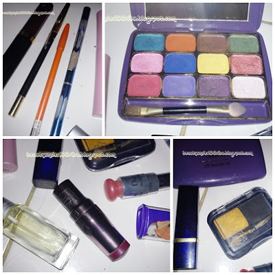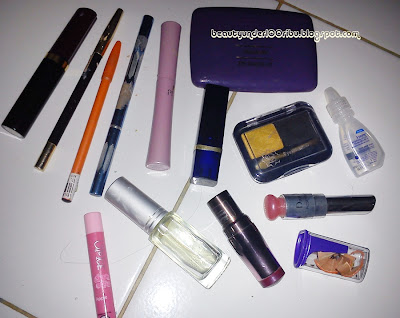 Hidup tanpa make-up itu hambar. Nggak ada warnanya. Jadinya saya membawa seperangkat pewarna muka di tas saya. Eyeliner, mascara, eyebrow, eyeshadow, dan eye-eye yang lain saya bawa. Termasuk lipstick, lipgloss, peraut, dan parfum tak lupa masuk absen kotak rias saya.
