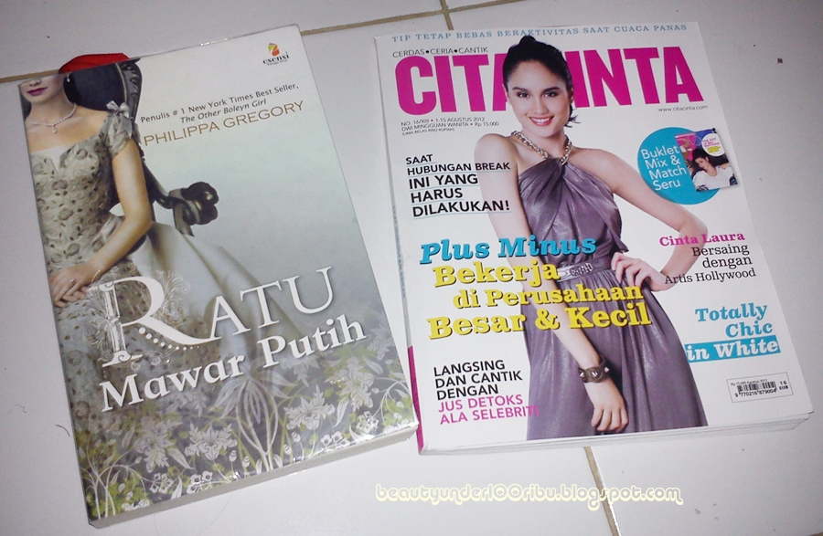 Okee, semua sudah masuk tas. Baju, daleman, aksesoris, make-up, skin-care, mandi, mukena, air mineral, laptop dan kekabelan, tiket, tapi ada yang kurang. Bacaan! Biar nggak bosen di sewawat atau di manapun ketika saya kehabisan bahan obrolan sama orang. Pelarian saya ya ke bacaan itu. Saat ini saya sedang merampungkan novel (cieeh, bahasanya "merampungkan", macam udah jadi penulis novel ajah. Hehehe) berjudul Ratu Mawar Putih. Pengarangnya adalah pengarang yang sama pada novel The Other Boleyn Girl yang dibintangi Natalie Portman itu loh. Untuk yang suka hal berbau British kuno, royal family, girl power, oke nih, buat dibaca. Rencananya nanti kalau sudah selesai, novel ini mau saya review di blog sebelah saya di andhikalady.blogspot.com.