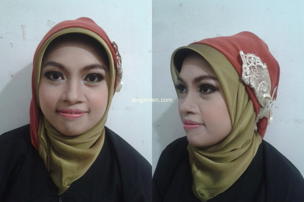 Dasarnya si teman saya memang sudah punya kulit bagus dan rata, sehingga tidak perlu banyak koreksi kulit. Saya memakaikan eyeshadow warna hijau dan cokelat, kemudian dibaur dengan sedikit shimmer keemasan. Lalu saya bentuk alisnya dan pasang bulu mata. Voilaaa...!