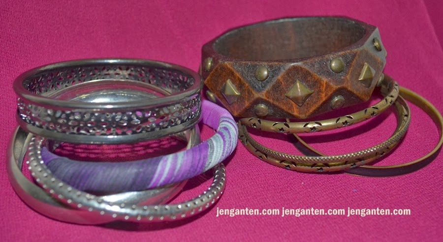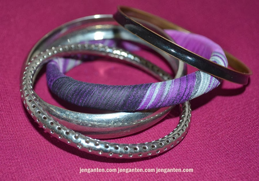 Terdiri dari 3 macam gelang logam dan 1 gelang ungu.