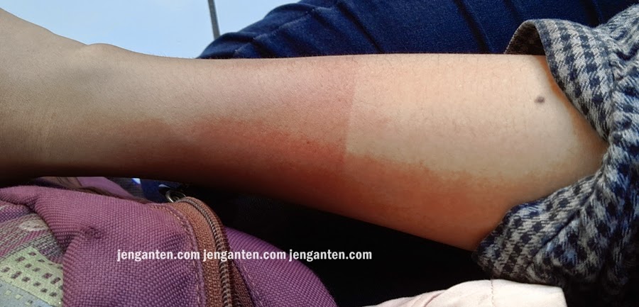 Kemudian tips berikutnya adalah pakai sunblock, as much as you can. Lebih baik lagi kalau sunblock-nya bertipe waterproof. Karena kalau nggak begini, efeknya bakal seperti foto terakhir di post ini. Memang pas lagi seru-seruan di air, rasanya masa bodo sama panas dan basah, tapi begitu selesai rafting baru deh kelihatan belangnya.