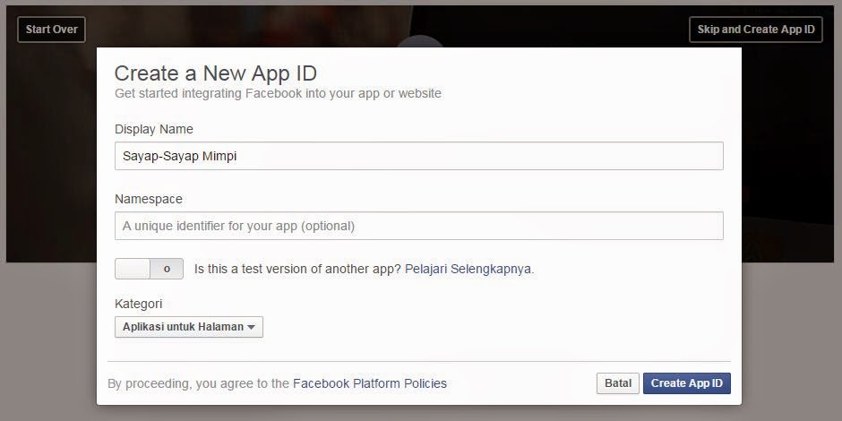 4. Isikan Creata a New App ID. Display Name: isikan dengan nama aplikasi yang akan kamu buat. Gampangnya, tuliskan saja judul blog kamu. Namespace kosongkan. Pilih kategori: Aplikasi untuk Halaman. Klik Create App ID.