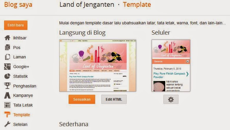 1. Kamu masuk ke dashboard Blogspot, pilih blog kamu, klik tombol Template.