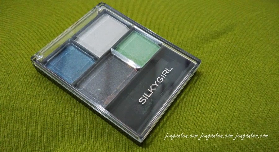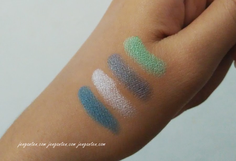 Sampai di titik swatch, saya suka dengan produk ini. Ternyata warnanya nggak jauh beda dengan pan. Di atas ini saya oleskan ke tangan tanpa pakai primer eyeshadow, langsung mak jeder warnanya kereng-kereng. Keempat warnanya memiliki butiran shimmer yang besar-besar. Fokus shimmering cenderung lebih banyak di warna abu-abu dan silver. Kau yang gemar dengan eyeshadow matte, akan susah menyukai eyeshadow ini. Sebaliknya, yang suka dengan benda berkilau seperti saya, akan dengan mudah jatuh cinta dengan eyeshadow ini.