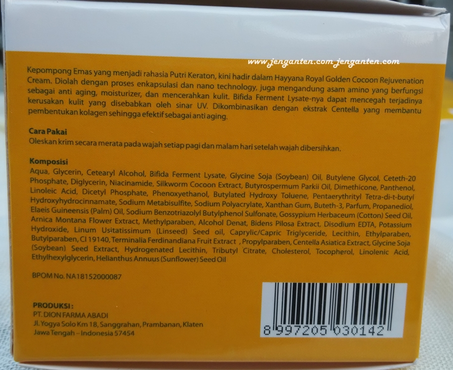 | Komposisi Rejuvenation Cream Hayyana. Klik untuk perbesar. |