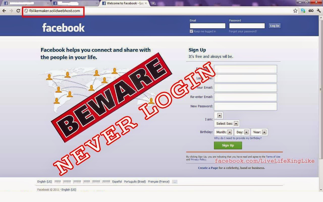 | Contoh halaman phising Facebook. Tampilannya persiiiis banget kayak Facebook beneran, tapi urlnya entah dari mana. Bener-bener bau pesing ya??!!! Sumber. |