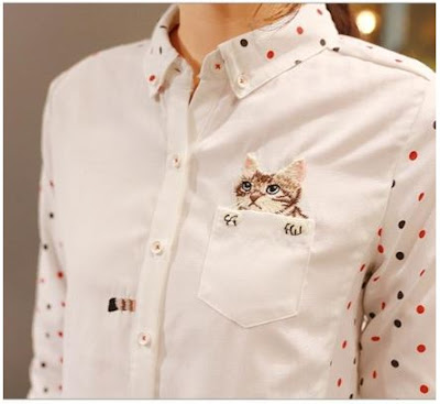 Saya tuh ya, kadang suka ngiler sama barang-barang lucu yang agak susah dicari. Apalagi barang itu berupa sesuatu hal berwarna putih (atau ungu, atau mint), polkadot, dan ada kucing-kucingnya. Misalnya kemeja polkadot dengan kucing yang lagi ngintip dari saku begini nih: