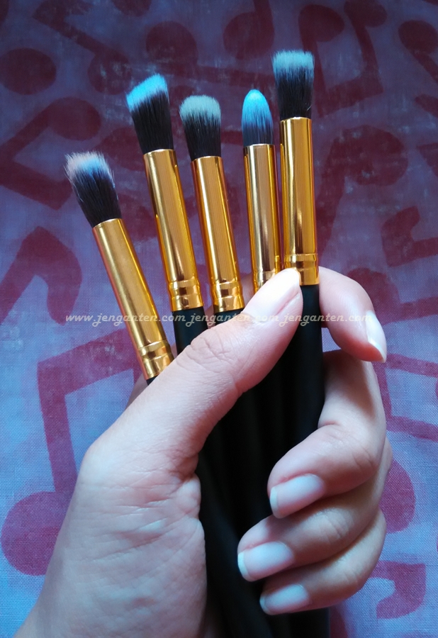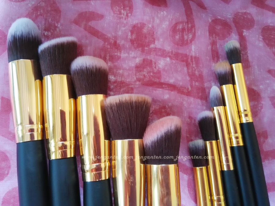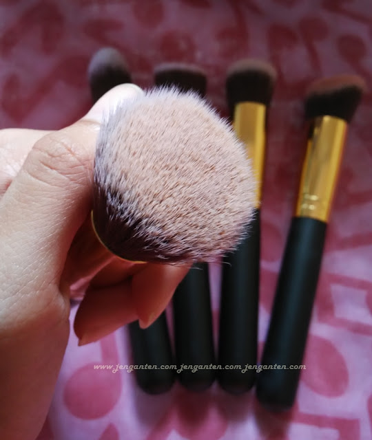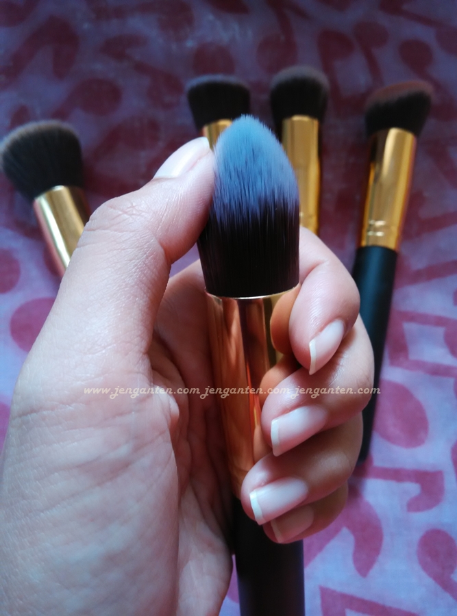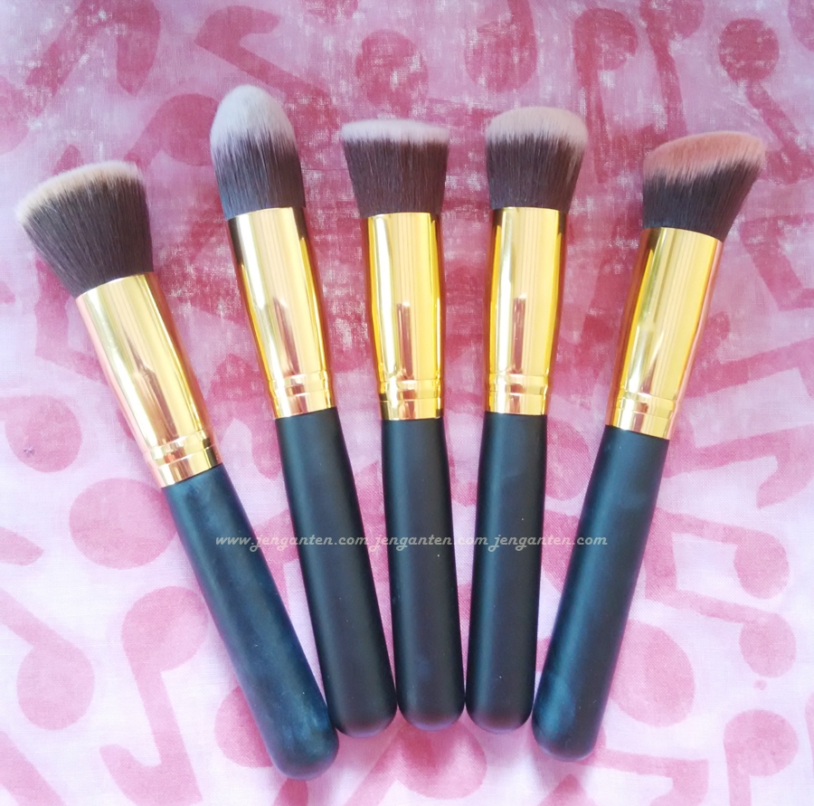Set kuas ini terdiri dari 5 buah kuas wajah (flat top, foundation, round top, angle top and angle flat top) -semuanya saya namai sendiri-, dan 5 lainnya kuas concealer, strobing, eyeshadow dan sejenisnya (lagi-lagi saya namai sendiri, karena memang tidak ada deskripsi namanya).