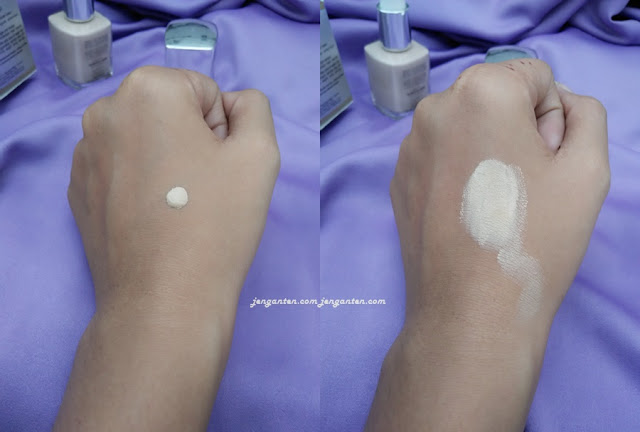 Pas saya coba di tangan, hasilnya memang jauh banget dengan warna asli kulit. Tetapi ketika dibiarkan lebih lama, warnanya mengikuti warna asli kok. Hasil di kulit adalah kesan yang halus dan menutup.