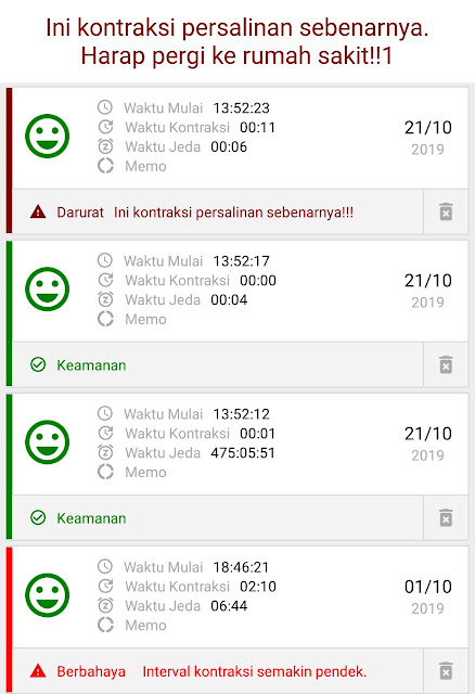 Menjelang siang, nyeri itu bukan makin berkurang tetapi makin bertambah. Kemudian saya menginstal aplikasi penghitung kontraksi dan mencatat setiap kontraksi yang timbul. Aplikasi ini pintar sekali, setiap kali kontraksi menjadi 5 menit sekali, ia segera mengeluarkan notifikasi untuk segera ke rumah sakit.