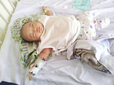 Di hari operasi, Linam diminta untuk berpuasa selama enam jam sebelum operasi. Prosedur ini tak terpikirkan oleh saya sebelumnya. Bayangin aja, namanya bayi usia dua bulan itu wajarnya minta nen sejam dua jam sekali. Nah ini disuruh nggak minum selama enam jam. Gimana nggak rewel dan kasihan coba? Untungnya suami tanggap dan kebanyakan fase puasa ini, dia yang gendong. Soalnya kalau saya yang gendong, Linam otomatis akan mencari nen. Antara nggak tega, tapi harus dilakukan. Karena saat dibius sebaiknya perut dalam kondisi kosong untuk mencegah masuknya makanan ke paru-paru yang dapat mengakibatkan gagal nafas.