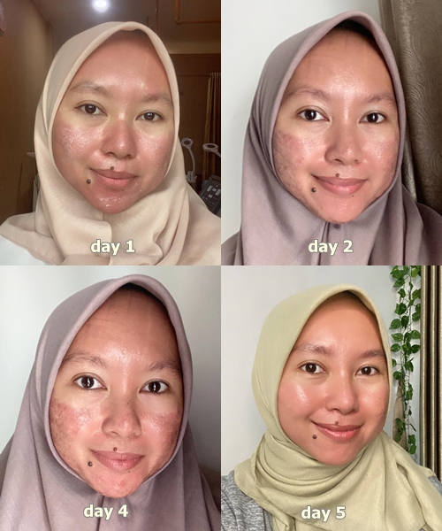 Day 2: Rasa panasnya sudah menghilang, tapi masih nyeri jika tertimpa air. Oiya, selama proses penyembuhan luka kamu hanya boleh cuci muka sewajarnya dengan air matang dan spons.