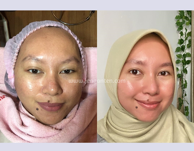 Maaf ya kalau fotonya 'mengerikan'. Wkwk. Setelah usai masa downtime treatment, kulitku berubah menjadi sebelah kanan. Alhamdulillah. Secara kasat mata terlihat: pori lebih kecil, warna lebih merata, dan tentu saja bopeng bekas jerawat tampak lebih samar. Gimana nggak senang? Aku sudah bertahun-tahun hidup dengan scar seperti itu tahu-tahu bisa punya muka yang mulusan. Hihi.