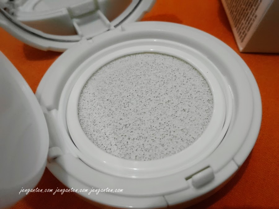 Di bawah tempat spons, adalah isi produk Any Cushion. Cushion kalau diterjemahkan artinya adalah bantal. Ya, memang bentuknya semacam bantal empuk atau busa yang berpori-pori. Busa inilah yang dijadikan sebagai rumah bersemayam produk Any Cushion yang bertekstur cair supaya nggak kemana-mana.