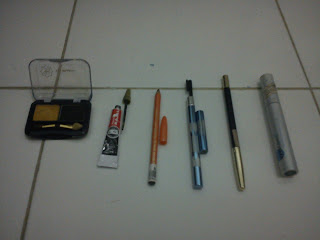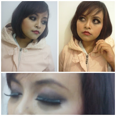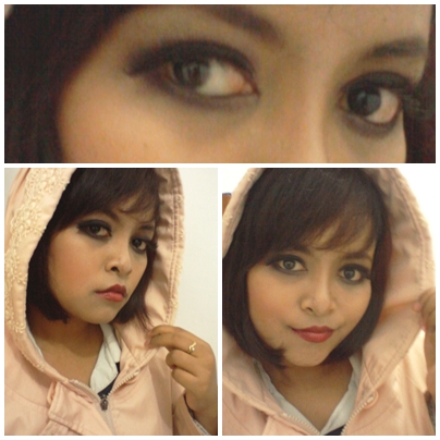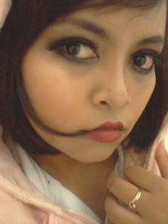 Karena kebetulan muka saya masih belum pulih dari peristiwa purging akibat Tretinoin, saya belum berani bereksperimen macem-macem dengan muka saya. Biarlah dia sembuh dulu dari jerawat dan kelupas. Hehe. *sabaaar*. Tapi meski begitu, hal ini tidak menyurutkanku dari hasrat untuk memakai make-up. Setelah mengelana mencari korban yang rela mukanya saya unyel-unyel ke sana ke mari, ternyata korban itu nggak jauh-jauh dari saya, alias tetangga kamar namanya Santi @saaantt (tapi bukan Santi nya om Rhoma lho yaa). Hehehee.