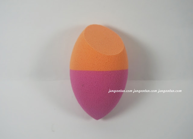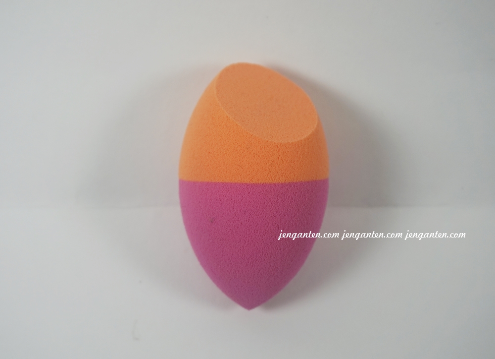 Sponge ini terdiri dari dua warna yang lucu, yang bikin siapapun yang memandang jadi ingin membawa pulang. Sisi bagian orange berbentuk agak papak di ujungnya; ini untuk memudahkan pengaplikasian foundation. Lalu sisi bagian pink digunakan untuk meratakan contour, highlight, dan blush on. Pokoknya dalam satu produk, sudah ada paket lengkapnya.