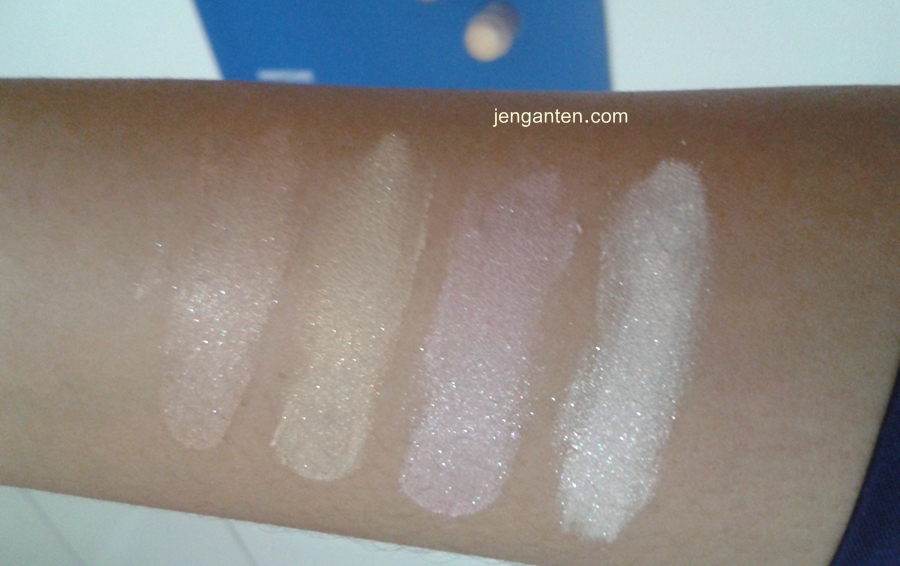 Keempat shade ini memiliki butiran shimmer yang kentara, dan cukup terlihat ketika dipakai di kulit. Saya suka yang warna pink, karena mirip dengan tone kulit saya dan mampu membuat kulit menjadi lebih segar.