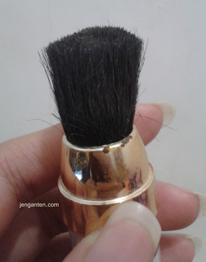 Dari segi kualitas kemasan, kalau dilihat sepintas sih kayaknya lucu dan elegan, ada warna gold dan dengan pelengkap sebuah kuas. Tapii, begitu dipegang, duh, kok plastiknya rapuh banget ya? Saya menduga jika kemasan ini jatuh, maka bedaknya akan bubar ambyar ke mana-mana. Kuasnya juga mengecewakan, bulunya kasar dan terasa nyelekit ketika dipakaikan ke kulit. Akibatnya, kuas ini nggak pernah saya pakai, kalau mau pakai bedaknya, ya pakai kuas tambahan sendiri.