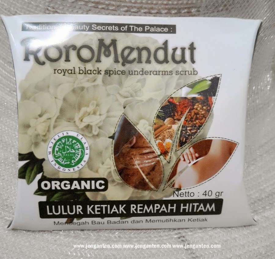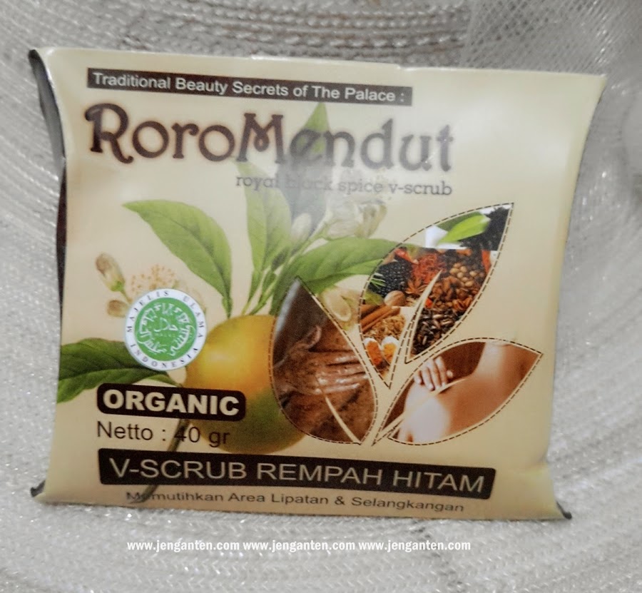 RORO MENDUT ROYAL BLACK SPICE - V SCRUB PEMUTIH SELANGKANGAN ORGANIK memadukan khasiat dari daun sirih, kayu rapet, lemon, teh hitam, rumput laut, rempah-rempah dan ketan hitam organic yang terkenal dapat menghilangkan bakteri dan mencerahkan kehitaman/kekusaman yang membandel, mengencangkan serta menciptakan keindahan sempurna pada kulit di sekitar area kewanitaan.