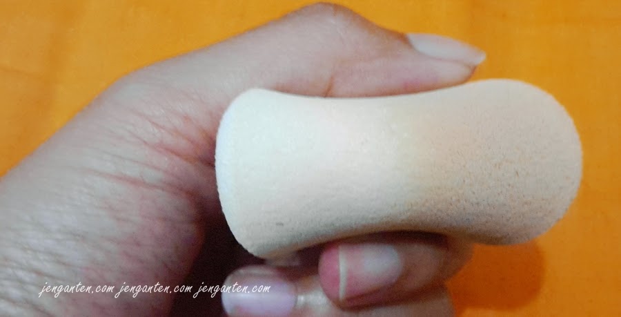 Dengan menyesal saya harus bilang bahwa spons bedak ini sudah saya buang sebelum sempat foto-foto dengannya. Spons bedak ini sudah saya ganti karena, spons bawaan sangat tidak direkomendasikan. Bentuknya tipis sekali dan mudah hancur. Saya hanya bertahan satu minggu saja dengan spons bawaan. Setelah itu, saya ganti dengan yang lain, atau memakai kuas saat memakai. Sesungguhnya saya selalu pakai kuas, tetapi sponsnya tetap saya biarkan untuk menutupi lubang-lubang bedak agar tidak berceceran.
